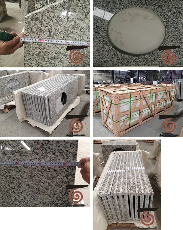 Granite countertops are sold alot to American market. These are 3containers Tiger skin white granite vanity and kitchen tops for a project inUS. We supply more than twenty types ofgranite colors such as black, yellow, gold, grey and brown etc. Most kitchen tops are 50px with lamiated edgesor 75px thick. Rectangle bowl cutout for kitchen or oval undermount bowl cutoutfor bathroom are necessary. Most granitetops are custom made based on project’s need.