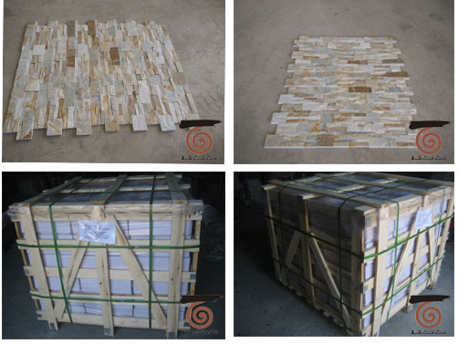 Standard size for this Wall stone panel is 35x18cm , 9 pieces per box , 60 boxes per crate . One 20 feet container we can load 24 crates and 816 m2 . For other color what we can supplied for the wall stone is black quartzite , rusty quarzite , rusty slate , black slate , snow white marble , Ivory white marble etc .