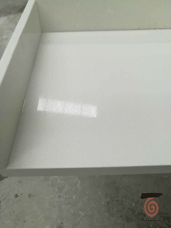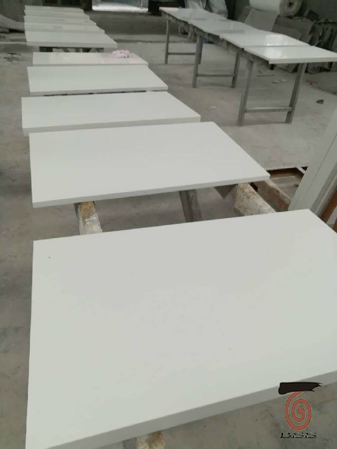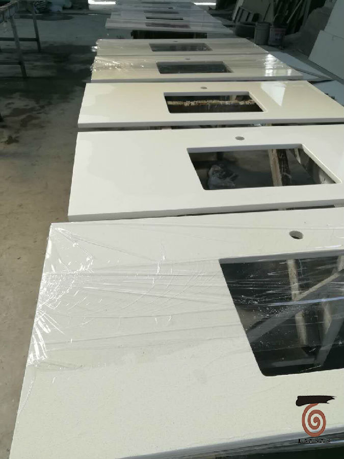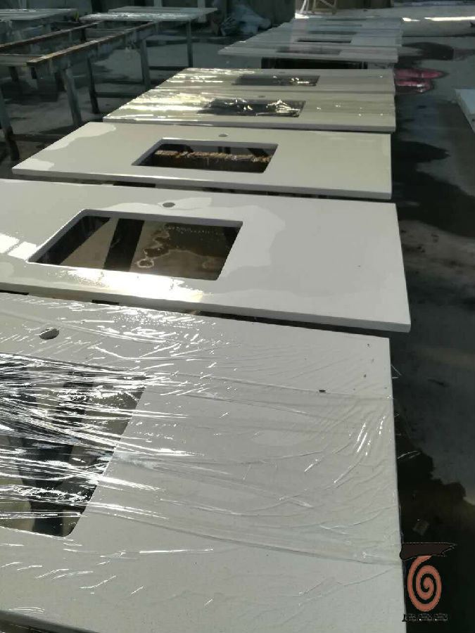 Quartz and artificial quartz stone are very popular in US and Europe. Every week we have container of quart stone kitchen tops and vanity tops shipped to abroad. This container contains Chinese quartz countertops with sink cutout to America. We also make other granite countertops such as Tiger skin white, Giallo St.Cecelia, Tropic brown, Tan brown , Uba tuba and so on.