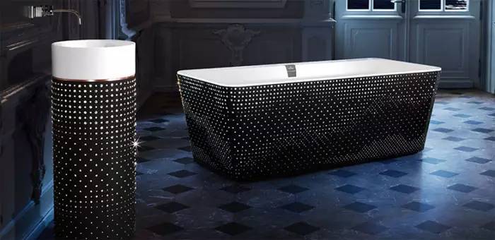 The Octagan Washbasin and Scarlet Crystal marble tubs are made of a leather-wrapped inner wall and a base for support, making a sparkling effect with classic gemstones and crystals. The combination of exclusive crystal craftsmanship and award-winning design makes this series a true masterpiece.