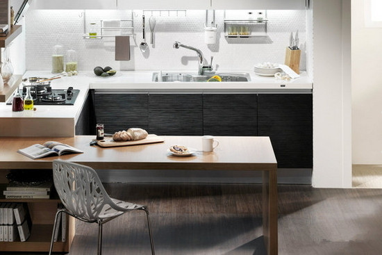 Nature stone tile-Black cabinets, white tiles, the overall design and the perfect combination of one kitchen, so that this is not a big kitchen like the owner of the same simple, capable, the details of the set also reflects the designer's unique and master for high The perfect quality of life requirements.