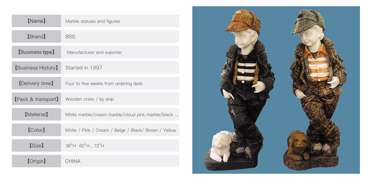 This a pair of children statue is a very good design of children. 2 dogs nearby their foot, this statue is carved by mixed marble in two gorgeously modern finishes.