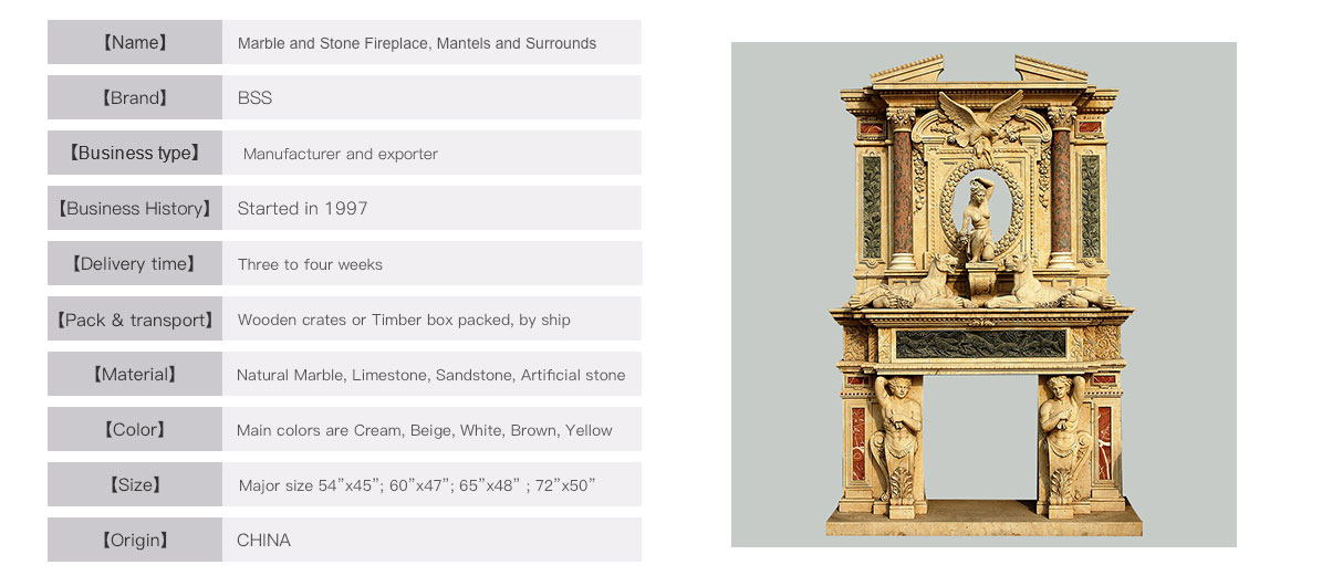 This elegant marble fireplace is a greattreasure for your house. Made in a fewnatural marble colors with lots of nicely carved statues throughout. It enhance the beauty of this master marblepiece in your luxury home. The beautifulartistic figures and patterns strengthen the top grade of the estate. It is highly worth of having this greatmarble item for lasting decades.