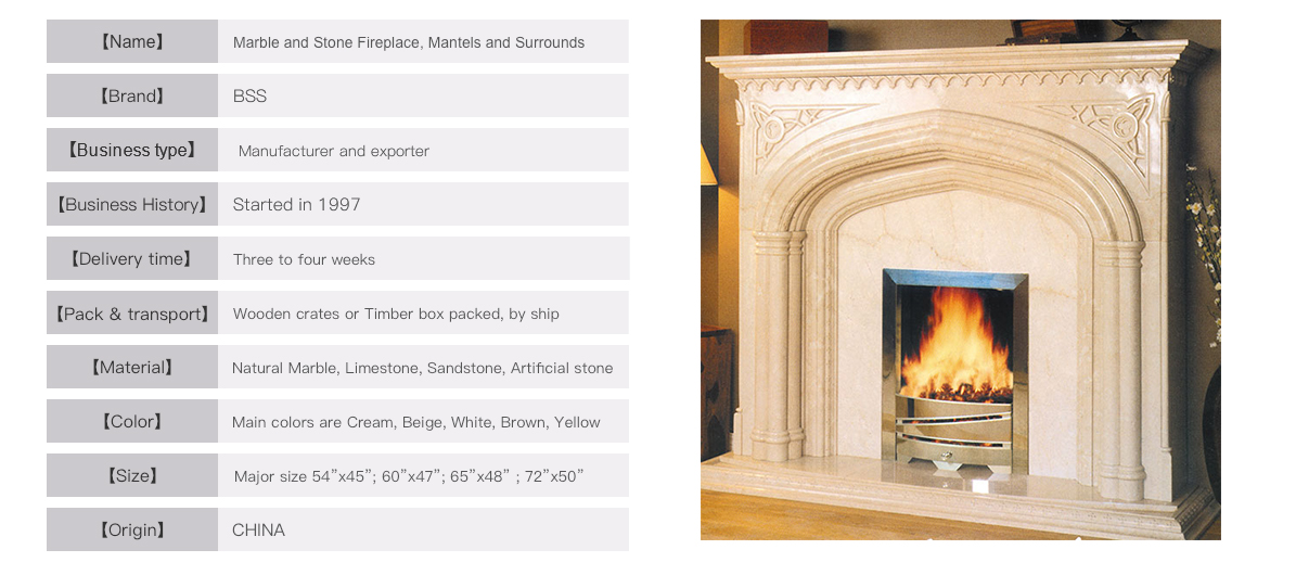 Character:Natural marble/solid with veins/polished finish/cream color.This amazing fireplace is nicely made in warm tone cream marble, suit with special shaped hearth and marble backpanel. The standard firebox size is 16inch wide by 22inch high. Some nice carving details, curved arch and special shaped parts around the whole fireplace create an upgrade marble piece for your luxury hose. Really a good treasure to enjoy a lot. Material and size can be custom made at your needs.