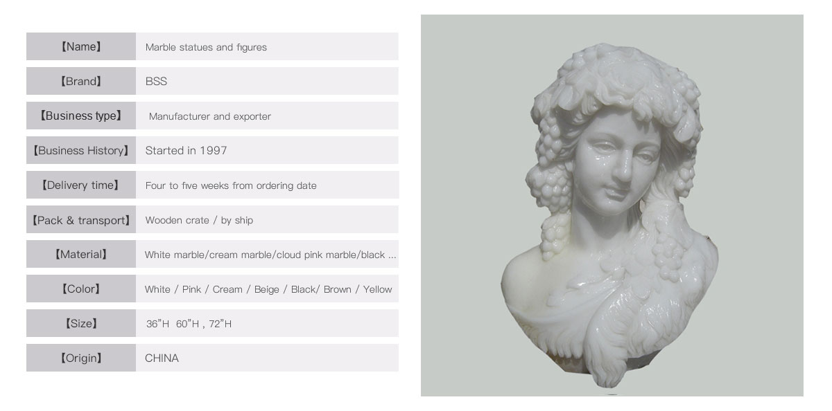 This excellent woman bust is finely madein high grade white marble. All detailsis hand-carved by our sculptor to show upgrade art work. It definitely enhance the beauty of yourhouse. Single unit or bulk order is available to deliver. Any custom design can be made by our team anddelivery time is 3 to 5 weeks.