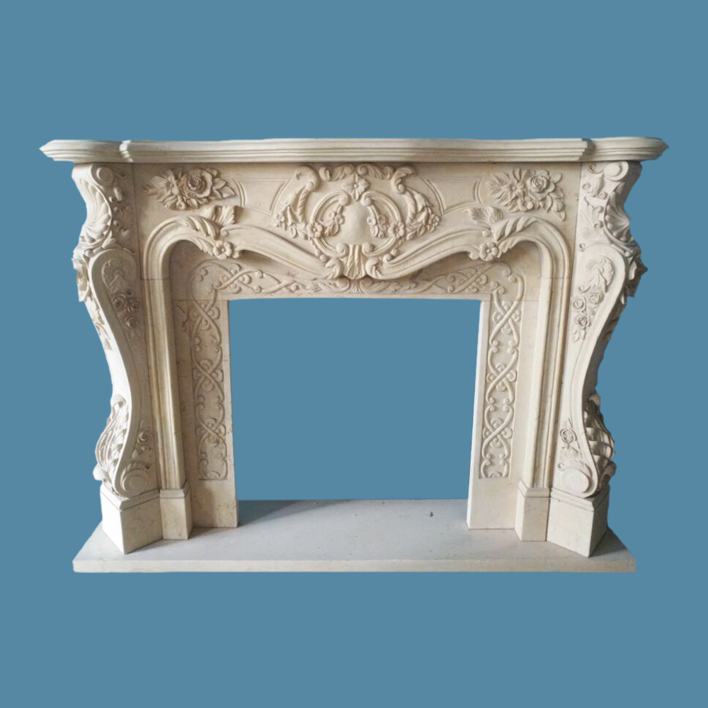 A very excellent mantel design is fully hand-carved by our master craftsman in beige limestone.