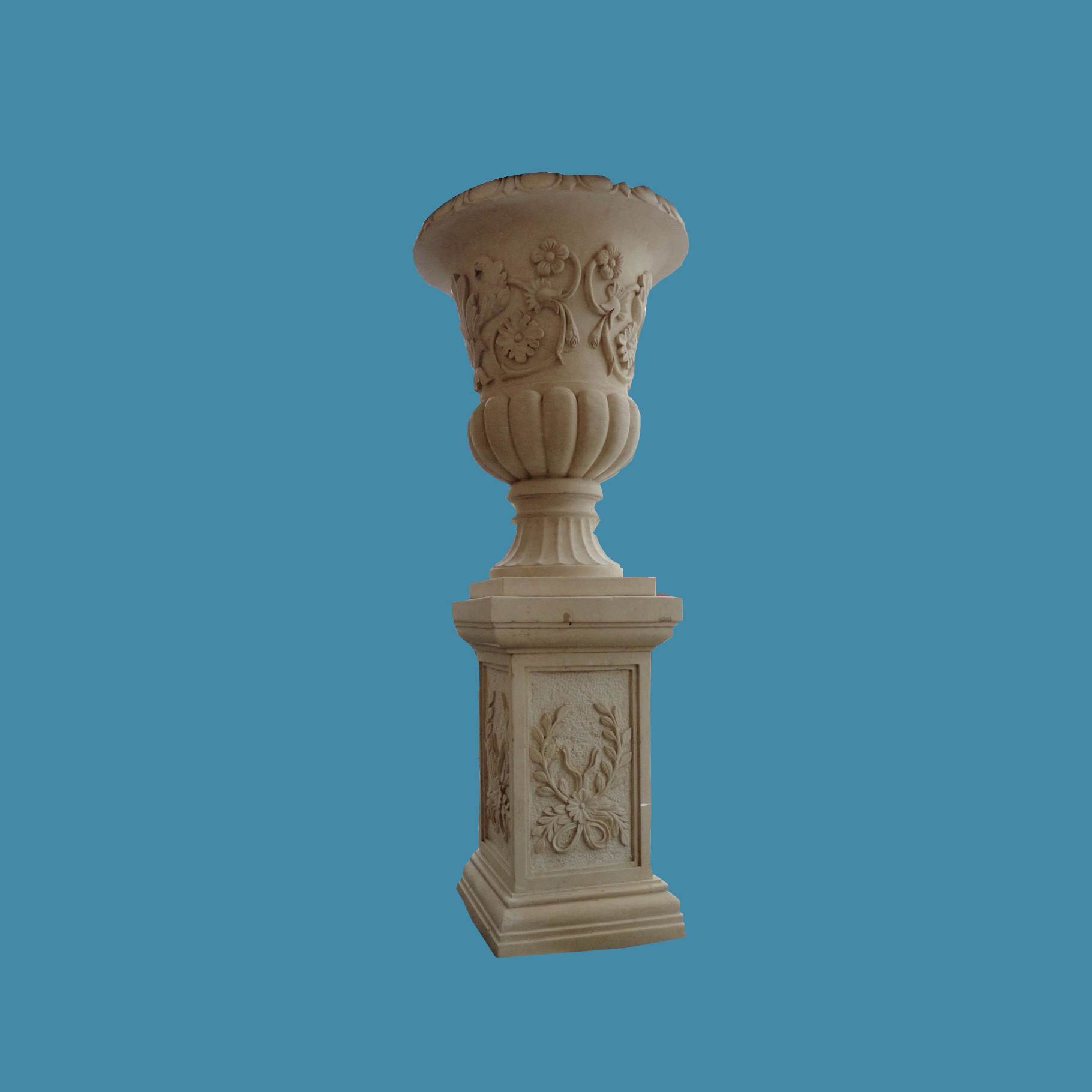 The whole planter is full of carved statues, flowers and patterns. It is made in one solid piece of marble which show all features of realistic sculptured , A terrific accent for the garden. Single unit or pairs are available to supply and delivery time is about 3 weeks to ship.