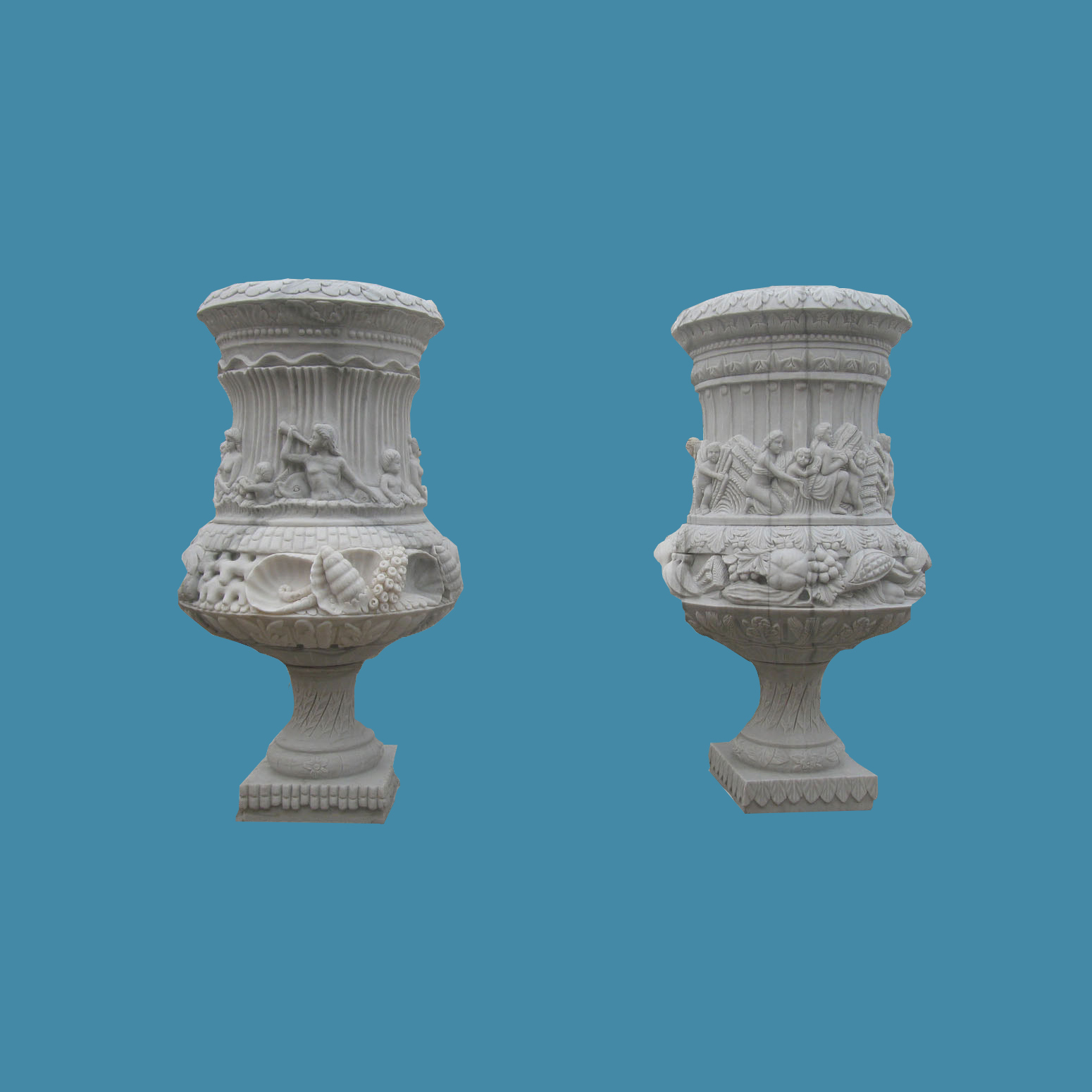 Character:natural marble/solid with veins / honed finish / Beige color. This beautiful natural beige stone is good choice to make this type of flowerpot. It looks like antique finished pots from old period. A high pedestal to suit the top fully carved urn with angel statues and flower patterns make it look really amazing. It is good treasure to enjoy long time in your luxury estate. Contact us immediately to get more information to purchase.