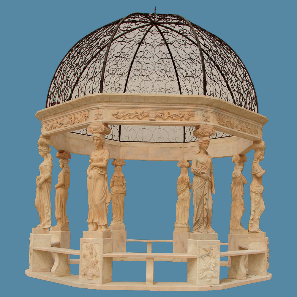 It is really a masterpiece marble workfor your estate, this amazing pink marble gazebo features of several life sizefemale statues dressed. Form the 8 marble pillars set in the gazebo, plus the big and nicely detailed wrought ironceling, dispaly a superior designed decorative marble work in the big garden.Material can be custom selected at your choice.