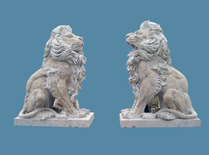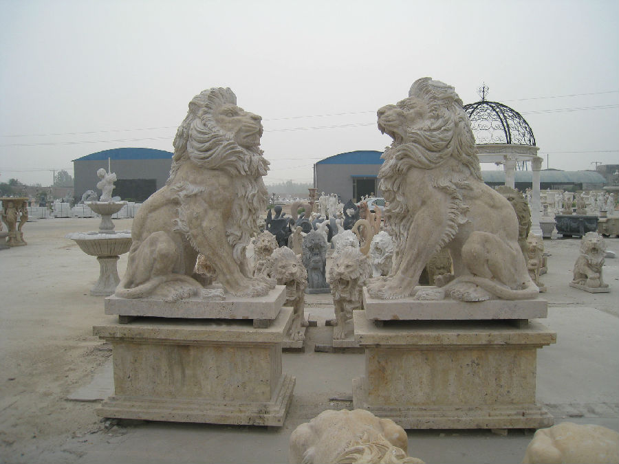 This pair of strong lion statue in one solid piece of travertine and with separate pedestal.It looks like antique finish to show a long period of stone sculptures.It definitely enhance the beauty of your estate with long impression.Single piece or pairs can be ordered as you want. Delivery time is 4 weeks to ship from China.