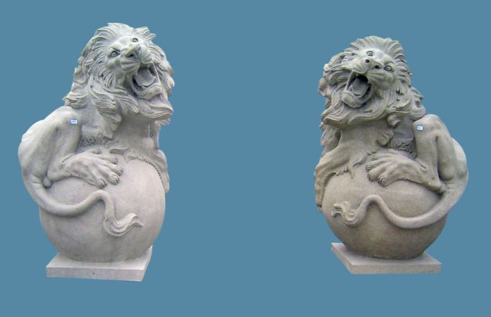 A special design of lion statues with ball , in one sold piece of natural sandstone with pedestal in solid piece of black limestone. The pedestal can be same material as lions. Dimensions can be custom made at your need, delivery time is 4 weeks to ship from China.