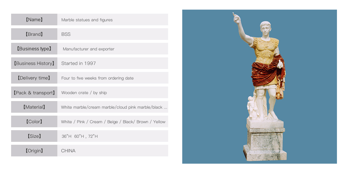 Caesar was a great and famous leader inancient Rome. This beautiful figure is hand-caved from three types of naturalmarble. The separate base 24” High makethis man statue looks stronger.