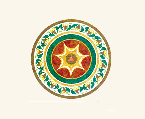 Stone medallion cut by water jet from natural colorful stone, fit together and mounted on mesh or tiles by experienced worker, can be various colors, patterns and sizes, suitable for indoor and outdoor space.