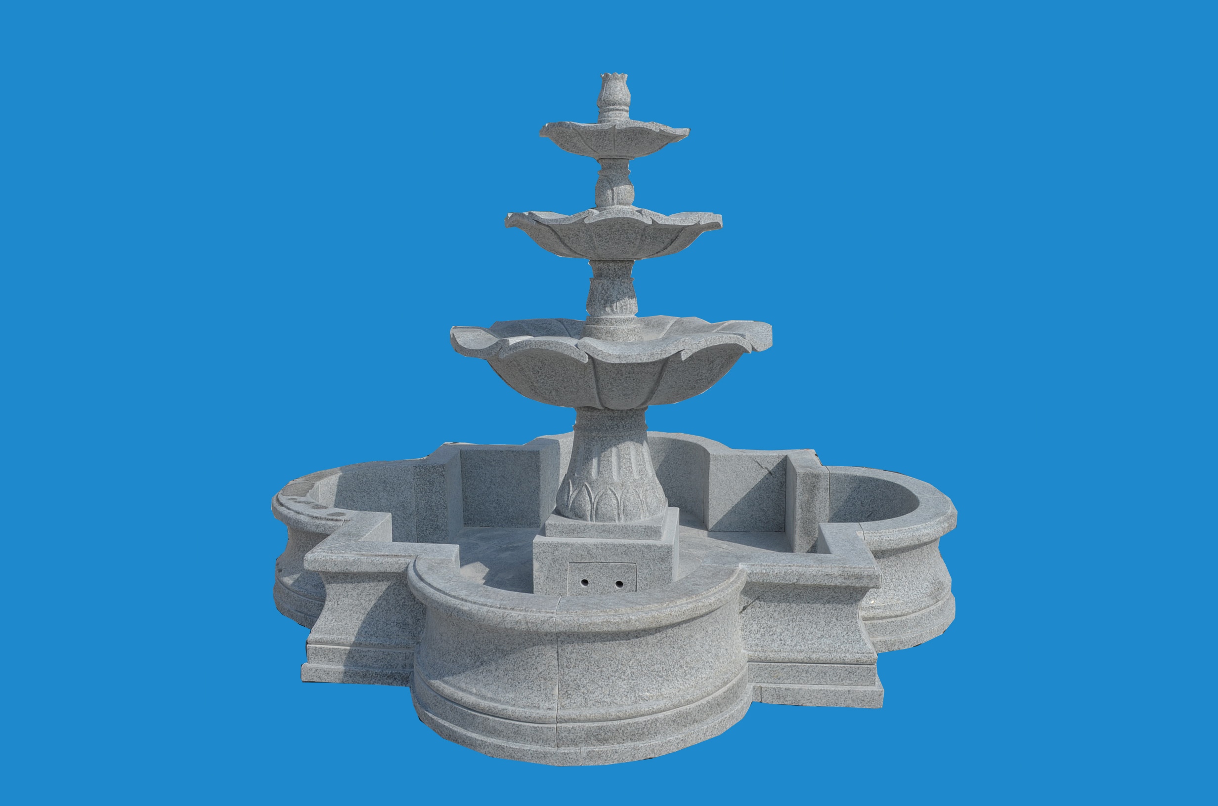 Granite is also widely used for water fountain, especially to place in outdoor with cold weather as it is stronger than marble. The shaped surround base shows a nicely made fountain for private house.