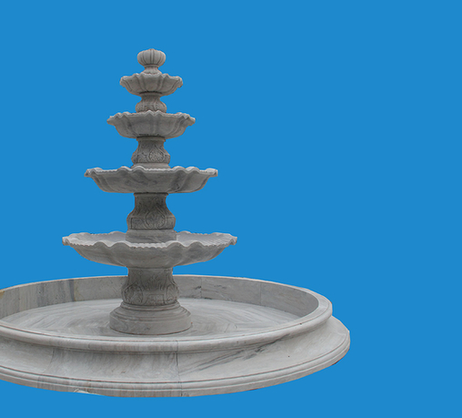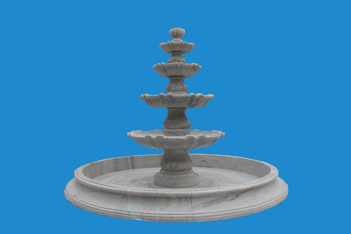 This water fountain with 4 bowls carved in a strong beige marble with grey veins. Water falls down from each bowl to bottom circle base surround. Dimensions can be changed to suit your garden site.