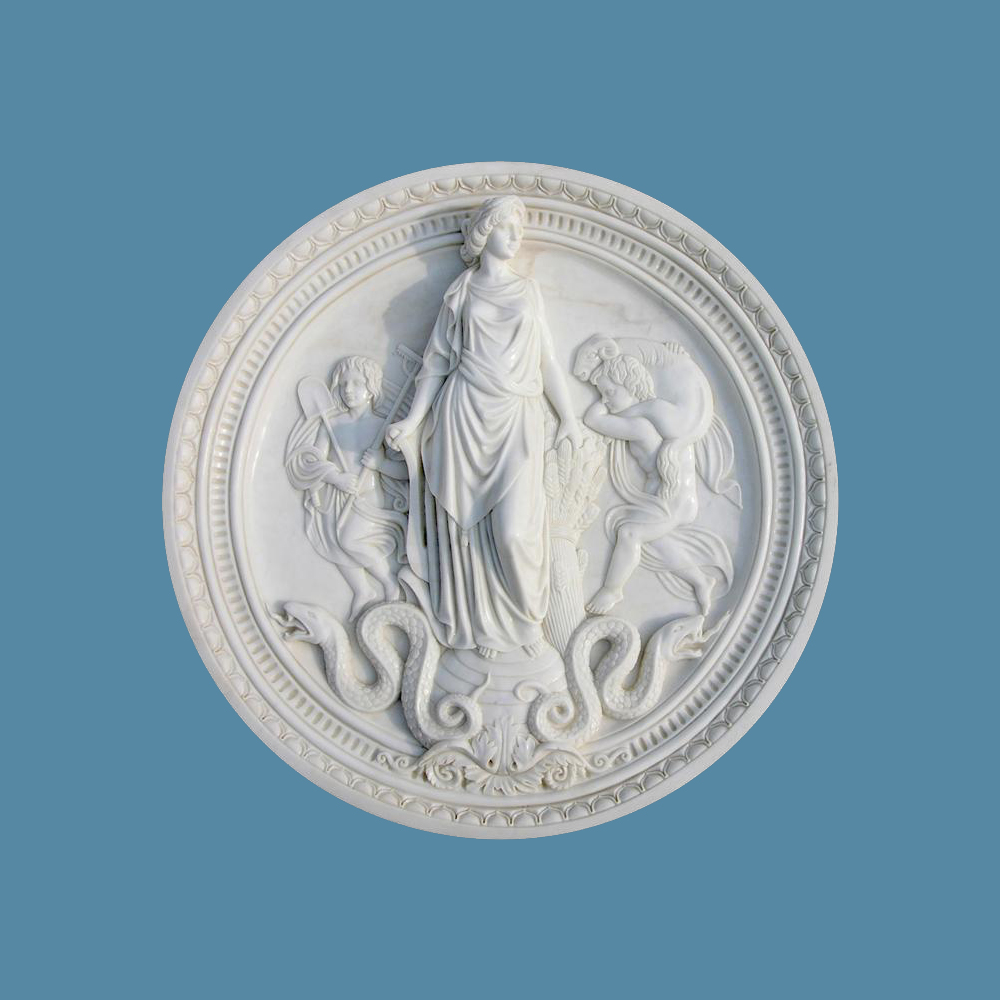 This stunning marble relief art work ina circle shape, fully carved in ourmaster cratfsman. The maiden with the angels greatly bring a amazing look ofwall décor. Highly polished finish in the natural white marble leave thisrelief lasting impression in the estate.