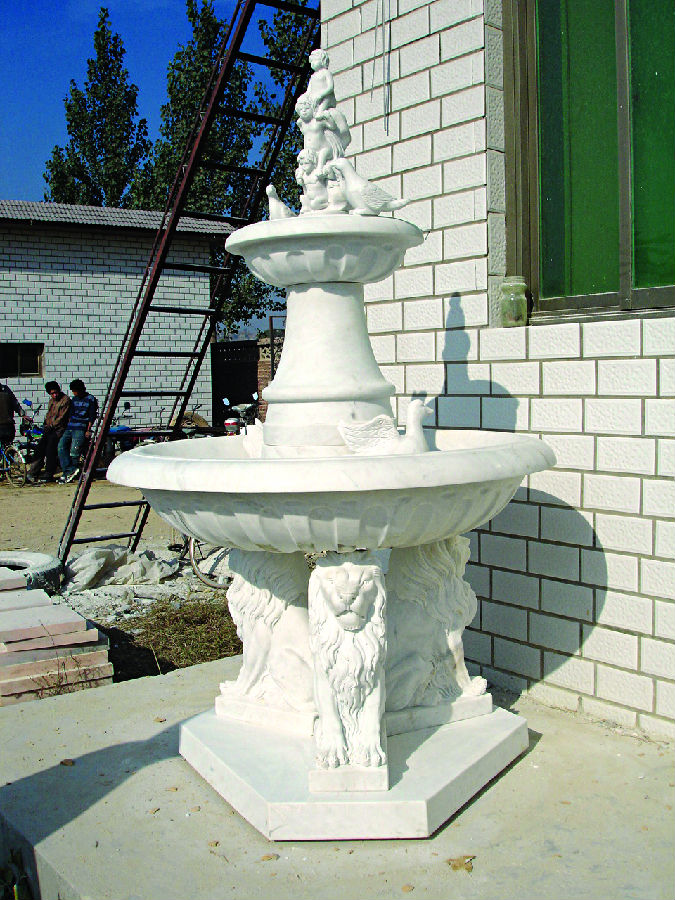 Character:Natural stone/solid and hard/polished/cream color .It is really amazing water fountain from a very good white marble. The nicely carved lions , birds and baby statues all around this fountain to create a master sculpture work to enhance the beauty of your estate. Many fountains are in stock for immediate delivery to any sea port or to your home address. Send us a message to get more information about it.