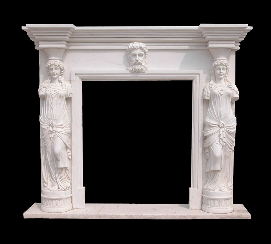 The hand-carved two lady figures,, man face all around the mantel to show an upgrade piece.