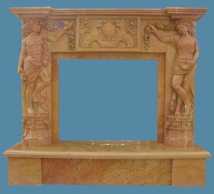 Character: Natural marble / solid with veins / polished / yellow color.This beautiful yellow marble mantel is hand carved with statues , animals and flower patterns
