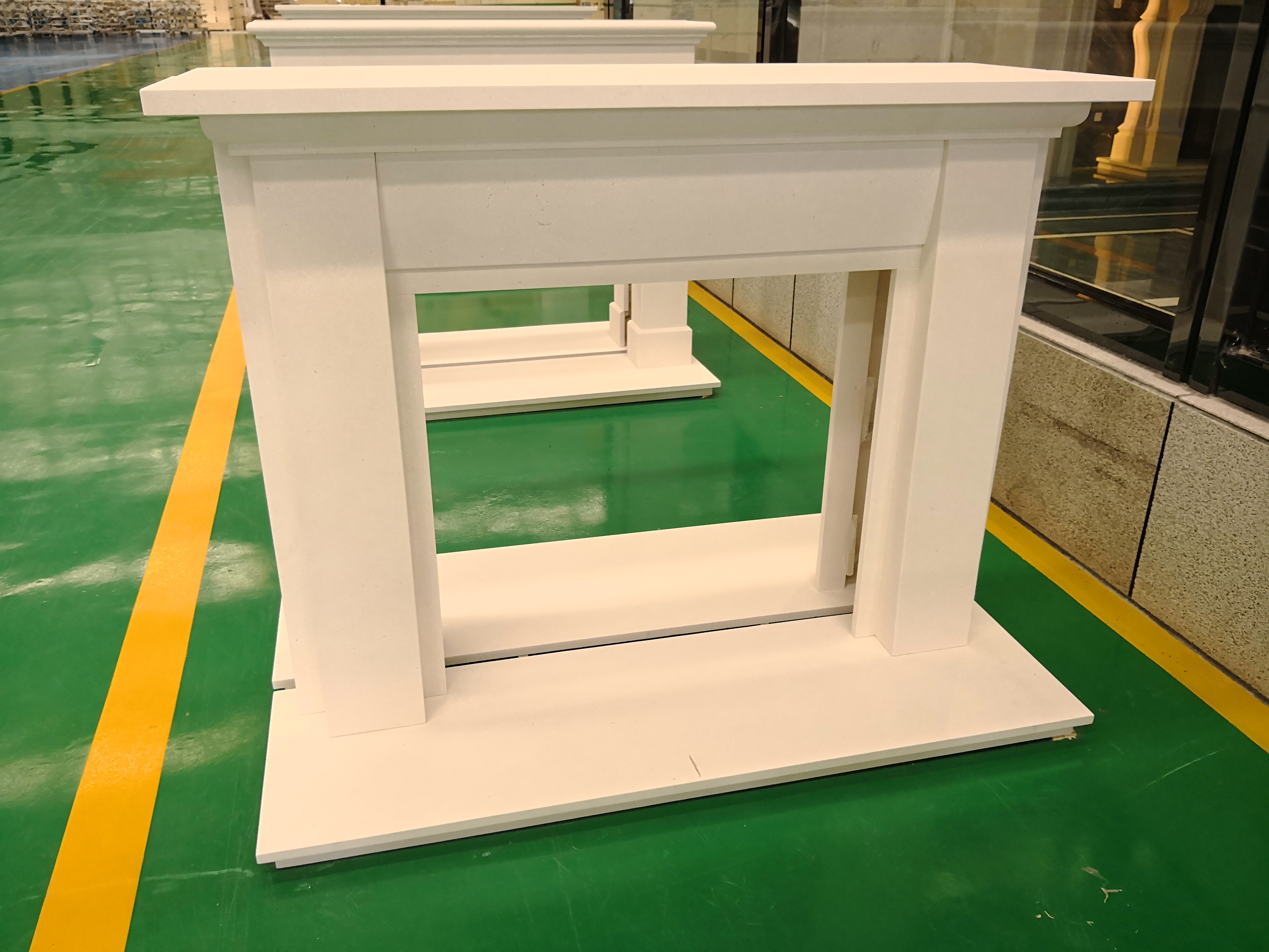 This is a verypopular mantel design made in white limestone for UK market. Material can bechanged in micro or natural marble too. It is normally suited with granite hearth and back panel or cast iron.