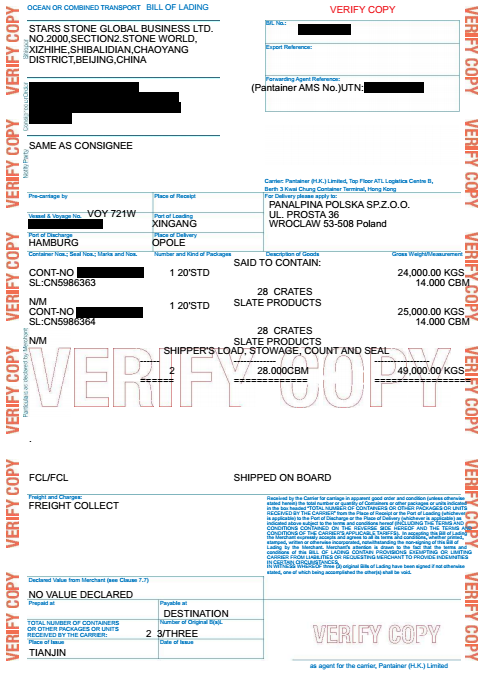 SHIPMENT :FROM XINGANG,CHIAN TO OPOLE POLAND