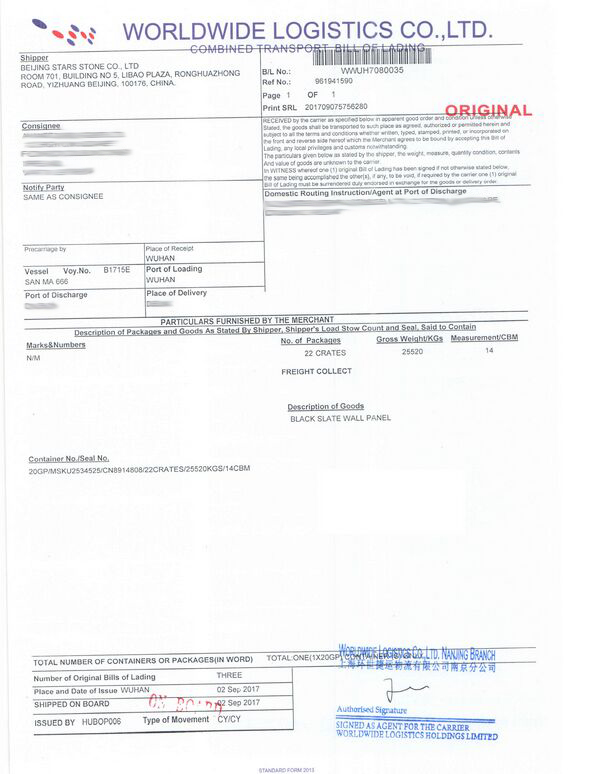 DESCRIPTION : Natural SLATE , one 20 GP' Container can load 24crates which around 500-600M2 . Any trade terms are availabe, FOB, CIF or Railway transportation works for most of countries since we have professional sea freight agents .