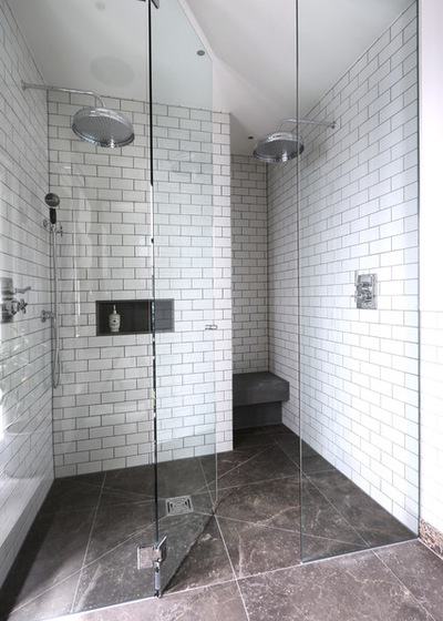 8. Be consistent with pattern. Use tiles in different sizes and colors, but keep the shape consistent for a harmonious effect. This bathroom includes oblong tiles in two colors and two sizes, but the same brick pattern on each surface creates a visual connection between the planes.