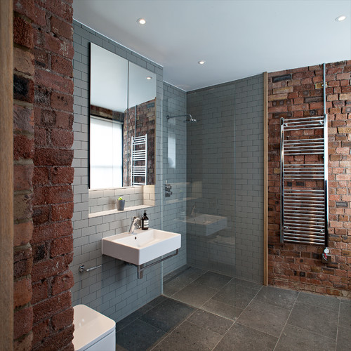 5. Combine matte finishes. For a bathroom with tactile appeal, choose two types of matte tile and break up large areas with an alternative surface, such as this exposed brick, or with plain painted walls.