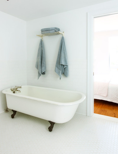 3. Play with scale. One of the most important tips for mixing tile well is to create balance by combining small- and large-scale patterns. In this bathroom three tile types are combined successfully: tiny hexagonal mosaics on the bath and walls, medium hex tiles on the basin surround and large oblong tiles on the floor. The monochrome palette helps create a harmonious whole.