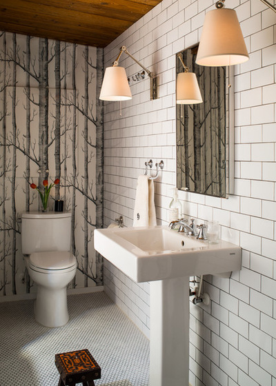 6. Juxtapose matte and glossy. Get away with combining similar-size tiles and busy patterns by choosing one matte style and one shiny. These high-gloss, beveled-edged subway tiles work beautifully with the soft encaustic finish of the monochrome floor tiles.