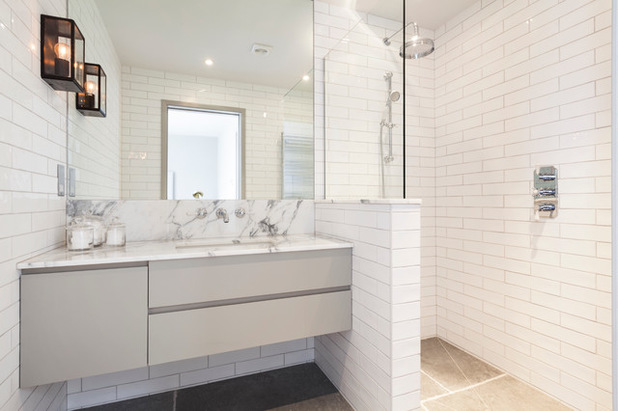 If you like your tiling to create subtle interest but for the overall look to make less of a statement, use matching grout. This bathroom features the same combination of tile types as the previous image, but coordinating white grout makes a huge difference in the finish and feel of the space.