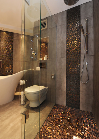 10. Use smaller tiles for better traction. What a wonderful bathroom! Here, designer Helen Scott used the same smaller tile throughout the bathroom as accent tiles.