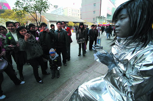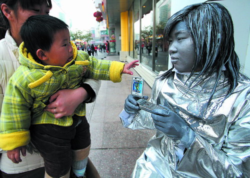 A woman wearing a space suit, holding a new mobile phone model, the whole "statues" painted silver-white paint, in the sun shining under the shine, a good chic statues! October 2007, Hefei Huaihe Road Pedestrian Street, when many people wonder why here added a statue here, a touch of the public screaming, the original statue was actually a big living! This is the current in many large cities popular living statue, its actor named Li Su-ting, Fuyang Linquan people.