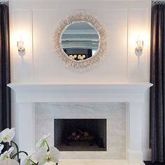 Love the marble around the fire box with a gray herringbone firebox,Marble fireplace inset and clean line mantel,An elegant living room that lends itself to a more formal space to host guests & entertain before dinner,Fireplace - Design photos, ideas and inspiration. Amazing gallery of interior design and decorating ideas of Fireplace in living rooms, pools, decks/patios by elite interior designers - Page 9.Stunning living room fireplace boasts a white marble surround and a contrasting gray herringbone firebox under a white mirror illuminated by nickel and glass sconces.