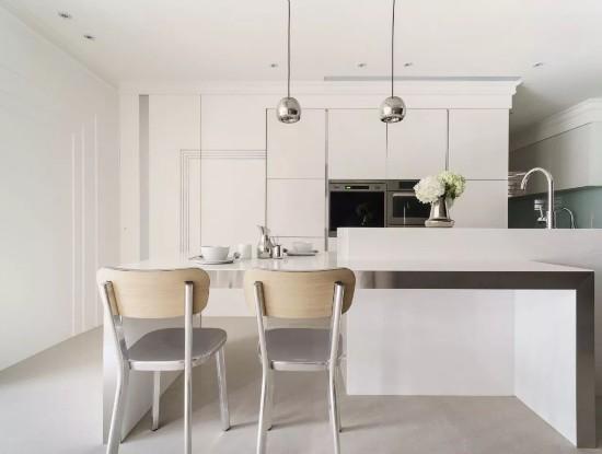 Into the living room, the wall inverted L-shaped plate is very attractive, "the idea, I have a very clear mind, the inverted L-shaped line is the design of the main shaft, the other part is kept clean. Line board, white, silver And a unique French healing made of stainless steel. "