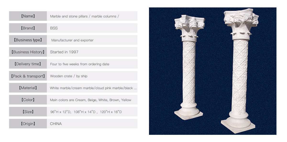 This marble column shown here is fullyhand-carved by our professional craftsman, made from a very white tone andstrong marble. The gorgeous capital andshaft are all designed well with artistic details. It can leave lastingimpression in your luxury house. Contactus to custom made with this type of pillar to suit your job site.