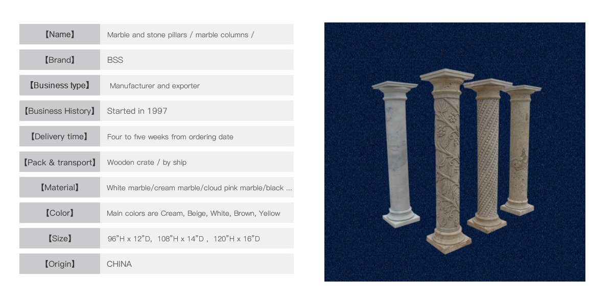 These pillars are finely made in marble and travertine. Some pillars are carved or twisted. They comes in three sections, single unit can be easily handled by one person. The size is normally from 32” to 48” height which is mainly placed inside of house. Custom design can be made by us and delivery time is 2 weeks to ship.