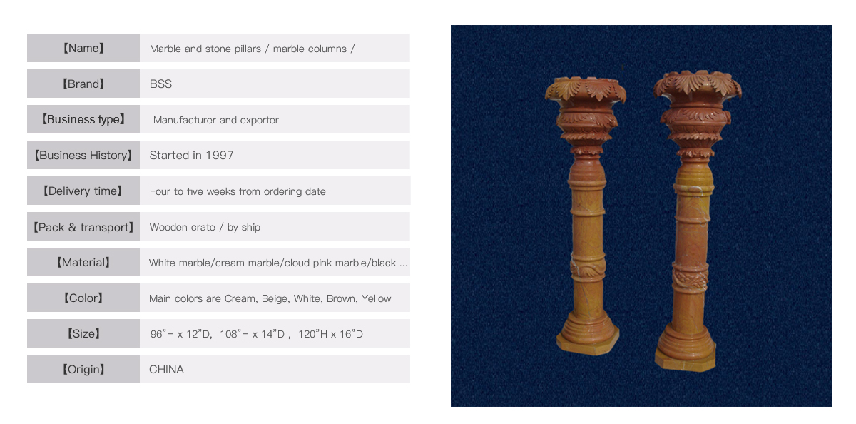 This amazing pillars style is finely made in yellow marble, top is a separate hand- carved beautiful urn. Really nice high quality marble piece to enhance the beauty of your house. Dimensions can be custom made by us and delivery time is 2 weeks to ship.