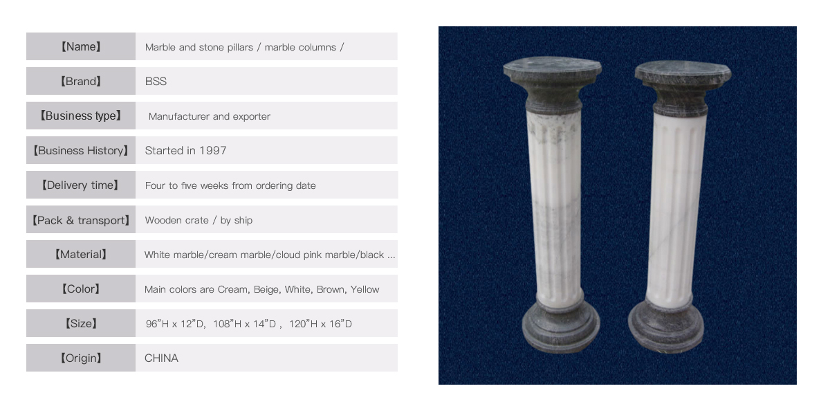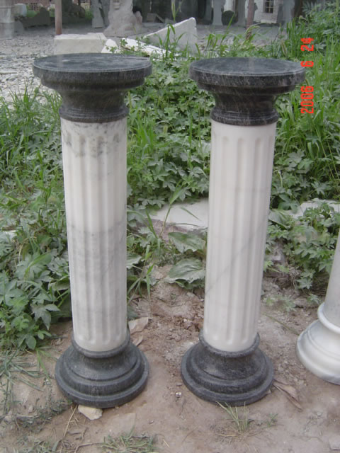 This pair of pillars are finely made in black and white marble. The top, shaft and base are all round shape and fluted body. Each pillar is in three sections which can be easily handled by one person. The size is normally from 32” to 48” height which is mainly placed inside of house. Custom design can be made by us and delivery time is 2 weeks to ship.