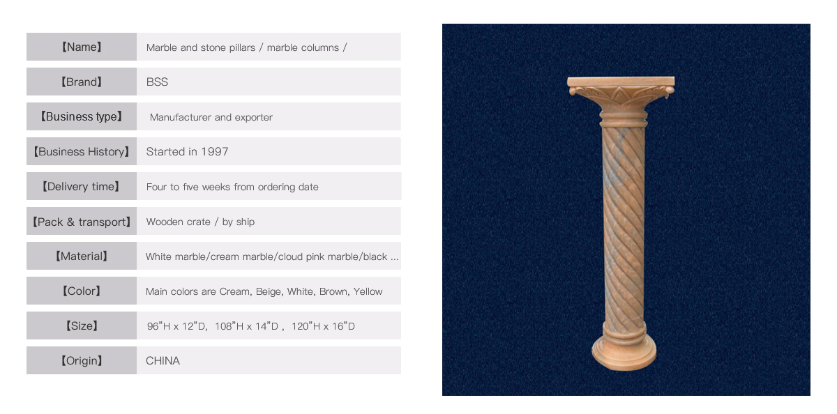 This beautiful column design is finely carved on top and twisted body in popular pink marble. The top is square design, body and base are round shape in three parts. Single unit can be easily handled by one person. The size is normally from 32” to 48” height which is mainly placed inside of house. Custom design can be made by us and delivery time is 2 weeks to ship.