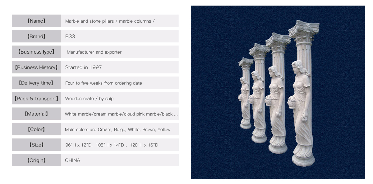 This gorgeous stone column is hand-carvedby our craftsman with lady figures in popular and strong beige stone. The beautiful shape, face, body and alldetails around this column really represent our high-skilled workmanship. It must enhance the beauty of your estate. Contact us today to get moreinformation.