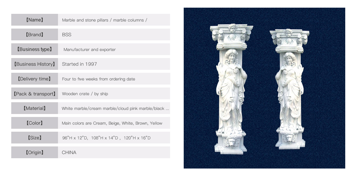 This excellent pillar design is finelymade by our craftsman with lady figures in popular and strong whitemarble. Dimensions and designs can beadjusted as you want. The hand-carved works around this column really representour high-skilled workmanship, enjoy this luxury marble work long time. Contact us today to get more information.