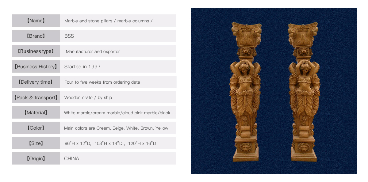 This elegant marble column is fullyhand-carved with lady figures in popular and strong brown marble. Thedimensions and material can be custom made to suit your job site. The carving flowers, lions head, patterns and statues around thewhole pillar to show upgrade marble piece to decorate your house very special Contact us today to get moreinformation.