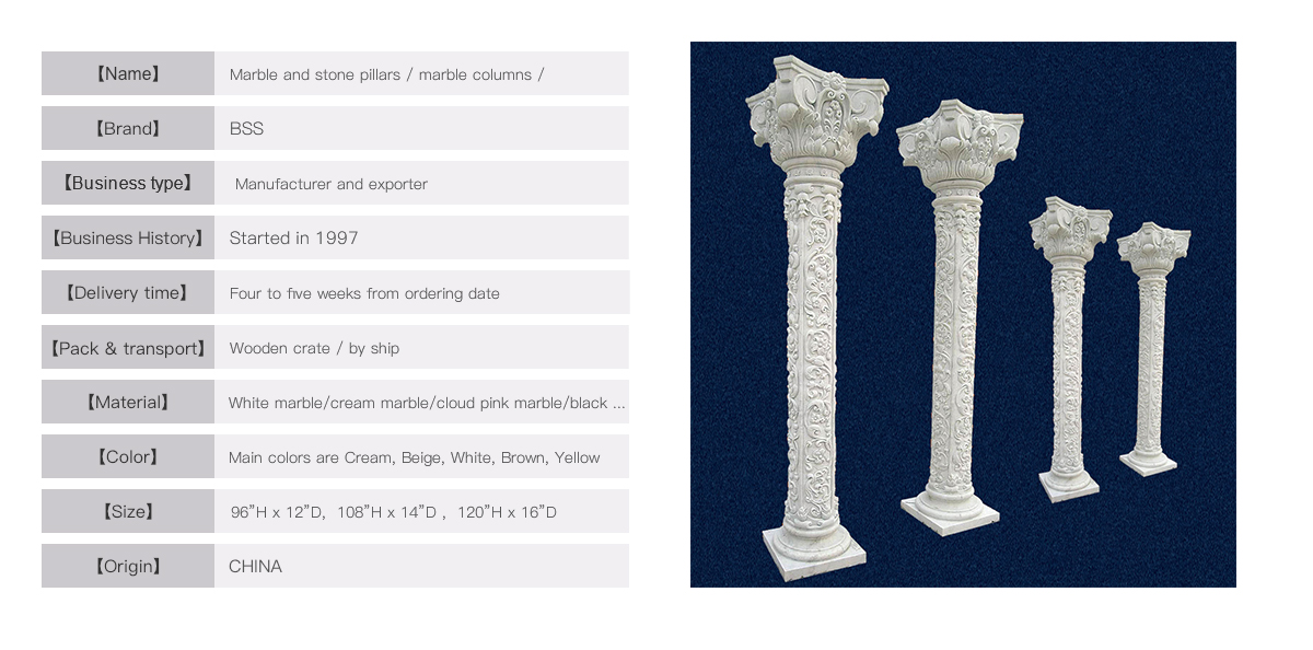 These grandlyfeatured columns from our very white and strong marble. The hand-carved capital and shaft by our master craftsman are full of artistic design, give your home a feeling of majestic beauty and upgrade. It is really impressive marble artwork fro your house. Contact us right now to get information you want.
