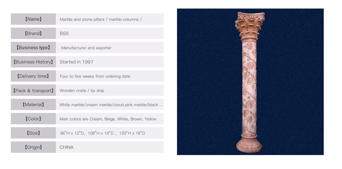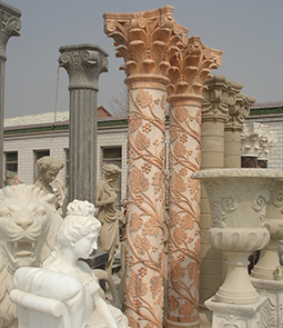 This magnificent marble column is made from a cloud pink marble, the hand-carved capital and shaft are really up gradeart work for your house. The beautiful acanthus leaves and grapes are decorated with the whole pillar. The size can becustom made from 7ft to 20ft or even bigger.