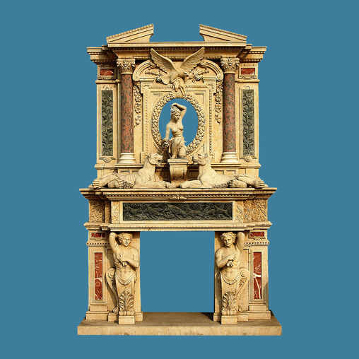 This elegant marble fireplace is a greattreasure for your house. Made in a fewnatural marble colors with lots of nicely carved statues throughout. It enhance the beauty of this master marblepiece in your luxury home. The beautifulartistic figures and patterns strengthen the top grade of the estate. It is highly worth of having this greatmarble item for lasting decades.