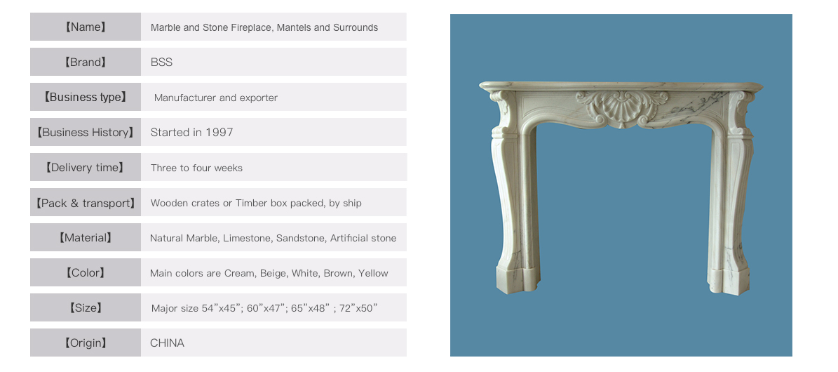 Description | This beautiful marble fireplace is carved in a warm tone marble, made up of 8 pcs marble. The back panels are included to suit the fire opening, all packed in one wooden crate. Supply capacity is 10 to 15 containers monthly, mostly to UK, Ireland, Russia and America. Single or several units, or full container are all available to supply and material can be changed. |