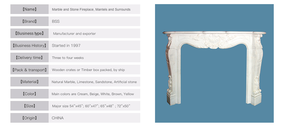 Description | This beautiful marble fireplace is carved in a warm tone marble, made up of 8 pcs marble. The back panels are included to suit the fire opening, all packed in one wooden crate. Supply capacity is 10 to 15 containers monthly, mostly to UK, Ireland, Russia and America. Single or several units, or full container are all available to supply and material can be changed. |