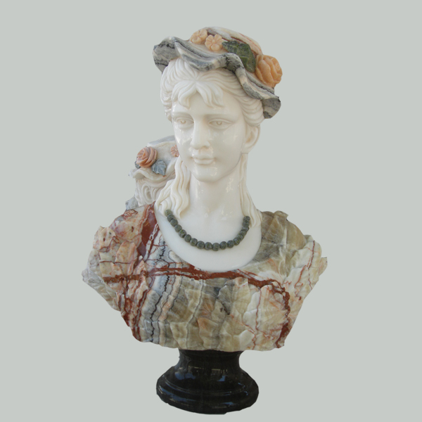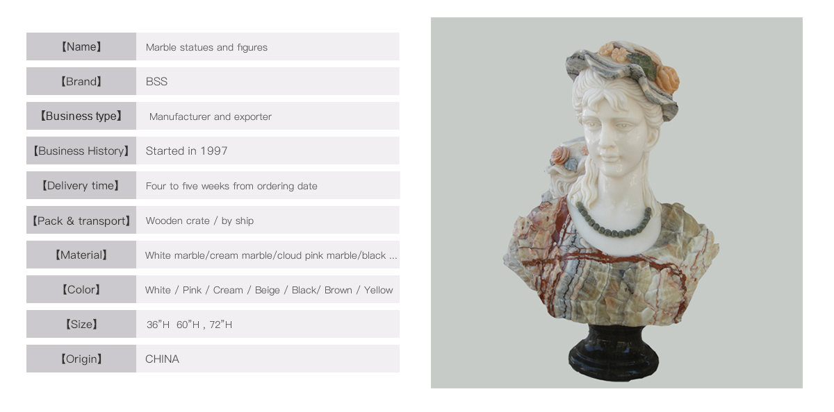 Thisexcellent woman bust is finely made in high grade natural marble. All details is hand-carved by our sculptor toshow upgrade art work. Marble of pedestal can be changed as you want, single unit or bulk order is available todeliver. Any custom design can be madeby our team and delivery time is 3 to 5 weeks.