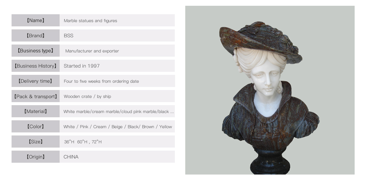 A very elegant woman bust with hat ishand-carved by our sculptor in white and green marble.